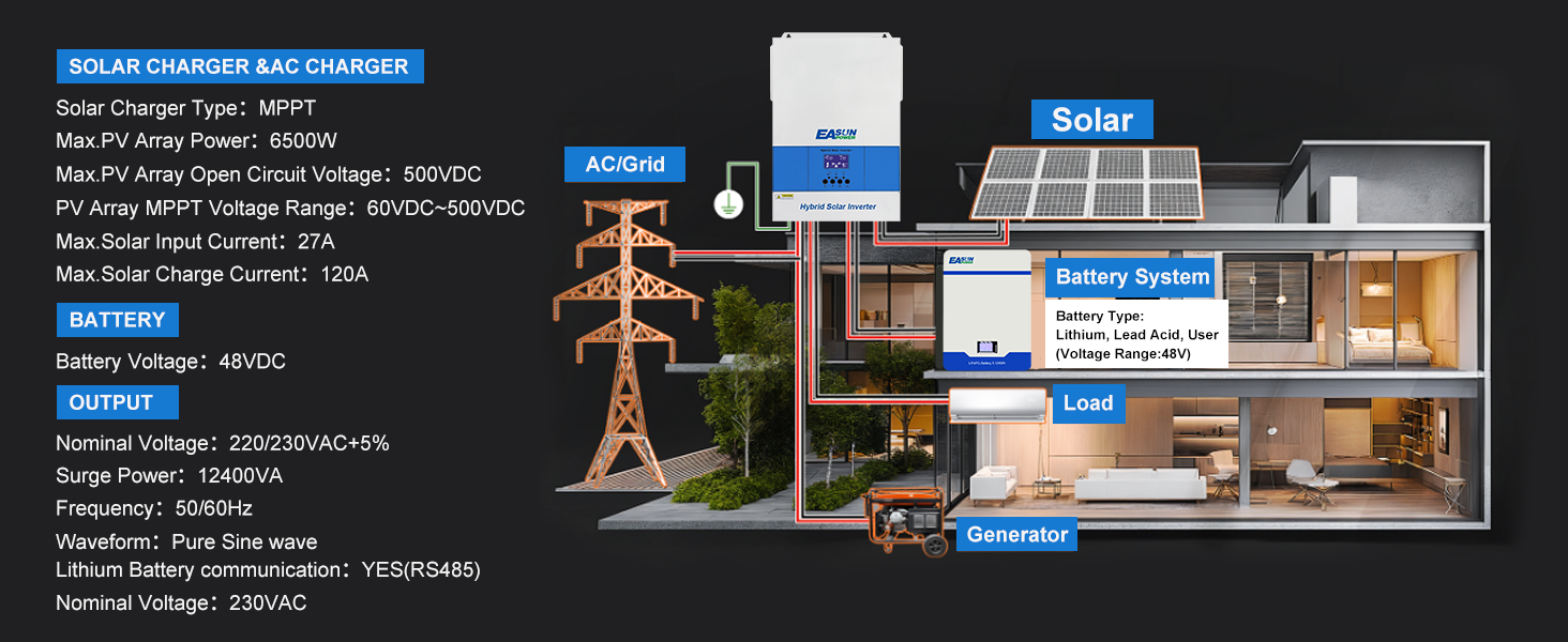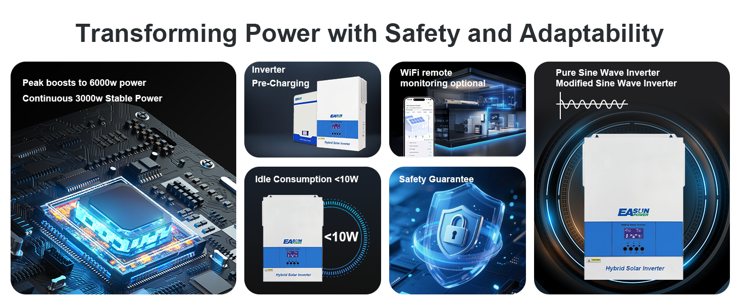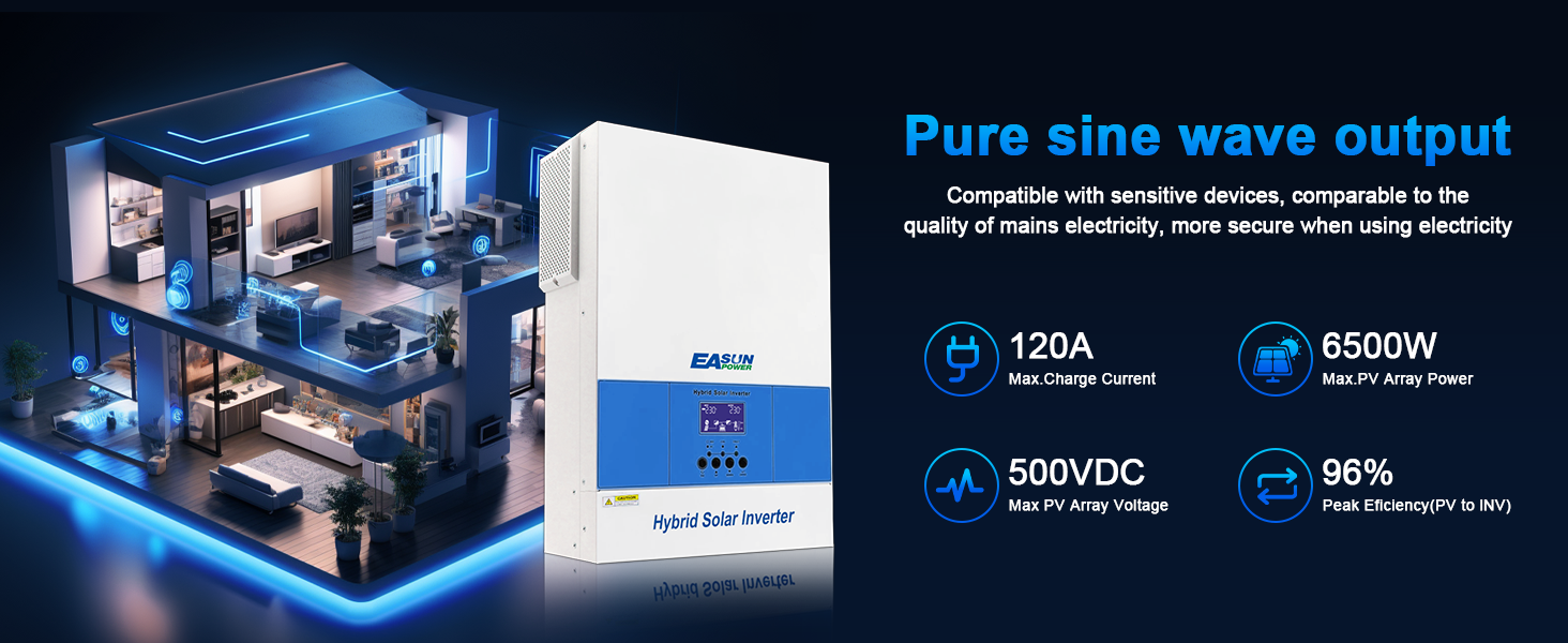 6200W Inverter: The Easun Power 6200W pure sine wave inverter efficiently converts 48V DC to 220V-230V AC. It provides clean, stable, and low-interference power output for all appliances, ensuring their long-term stable operation.