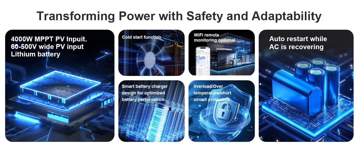 This highly efficient and stable energy solution is designed for both home and commercial applications. It utilizes advanced pure sine wave output technology to ensure smooth and pure output current, protecting your delicate appliances. A built-in high-performance solar charge controller intelligently adjusts charging and discharging efficiency, effectively extending battery life.