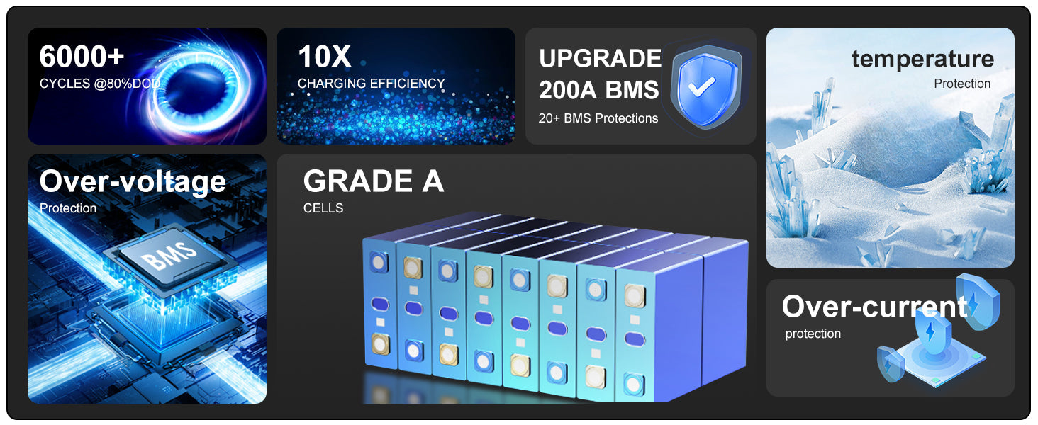 Built with A+ grade cells, 6000+ cycles @ 80% DOD,offering low risk of overheating or fire